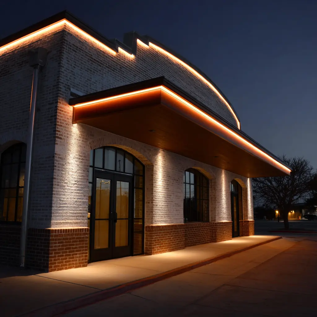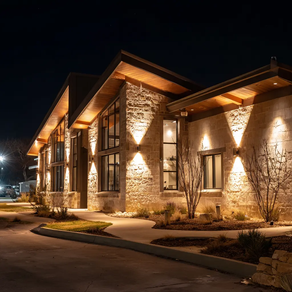 Glacier Home Exteriors now offers commercial permanent lighting for businesses and municipalities in Waco, Temple, Belton, and Killeen. Our systems provide consistent, app-controlled illumination that enhances safety, highlights architecture, and creates an inviting atmosphere for customers, visitors, and staff. From car dealerships to city buildings, our commercial lighting solutions are designed to make your property stand out day and night.